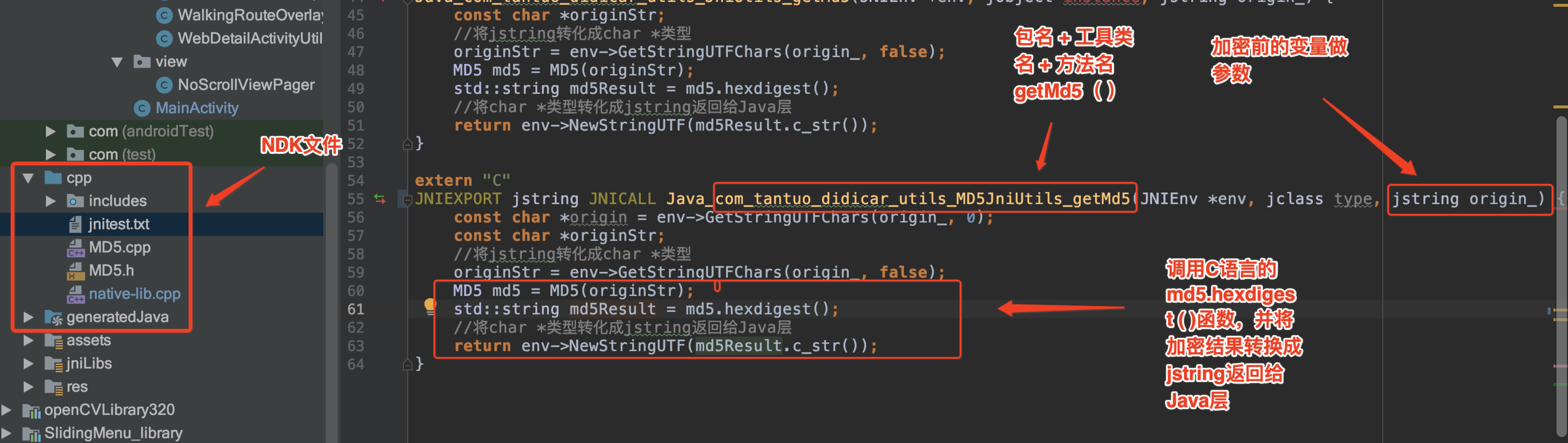 下面的图可以看到 native-lib 是如何帮助 MD5JniUtils 类的 getMd5 () 方法调用 C语言加密方法的,JNIEXPORT 和 JNICALL 两个宏用来标识函数用途是调用.so 库,就好像 C++可以调用 .dll 动态链接库一样,后面紧跟的是函数名,命名规则很重要:Java_ + 包名 + 调用这个加密算法的Java工具类名 + Java调用方法 ,后面的变量参数是Java中String类型对应的JNI jstring类型,下面在方法体中,就可以使用对传入的加密前字符串进行加密的C语言运算了,并把加密完成的 jstring类型结果返回给java层。